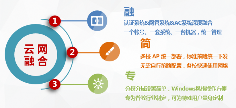 “人‧网络 深度融合管理”是指智云管理平台能够将网络中的用户认证管理、用户权限管理、网络设备管理、无线AP管理等统一起来,深度融合,并能够作为后期业务应用的平台,还可以为其它应用给予相关的标准接口。